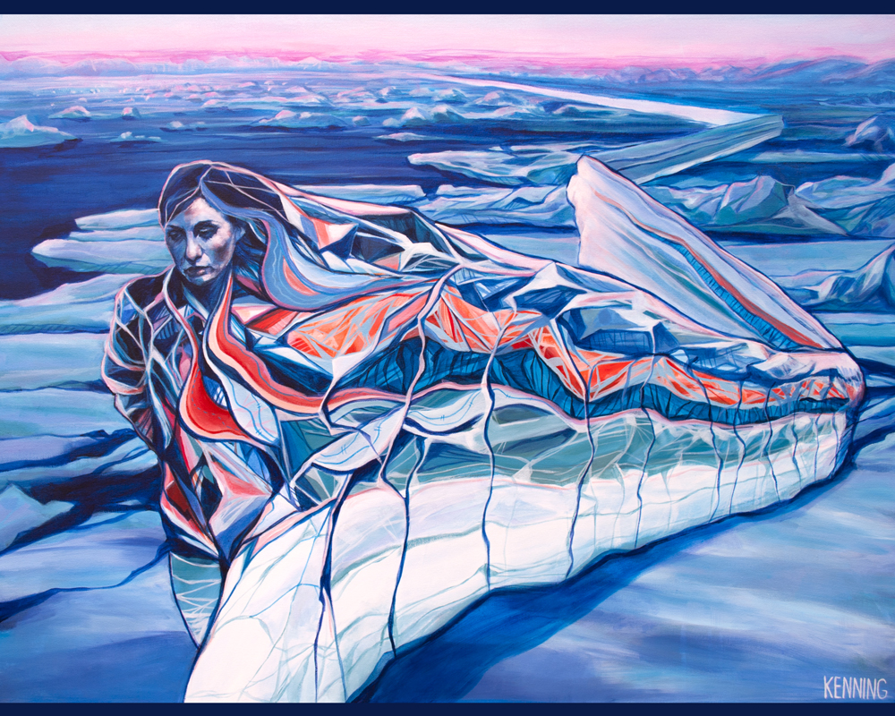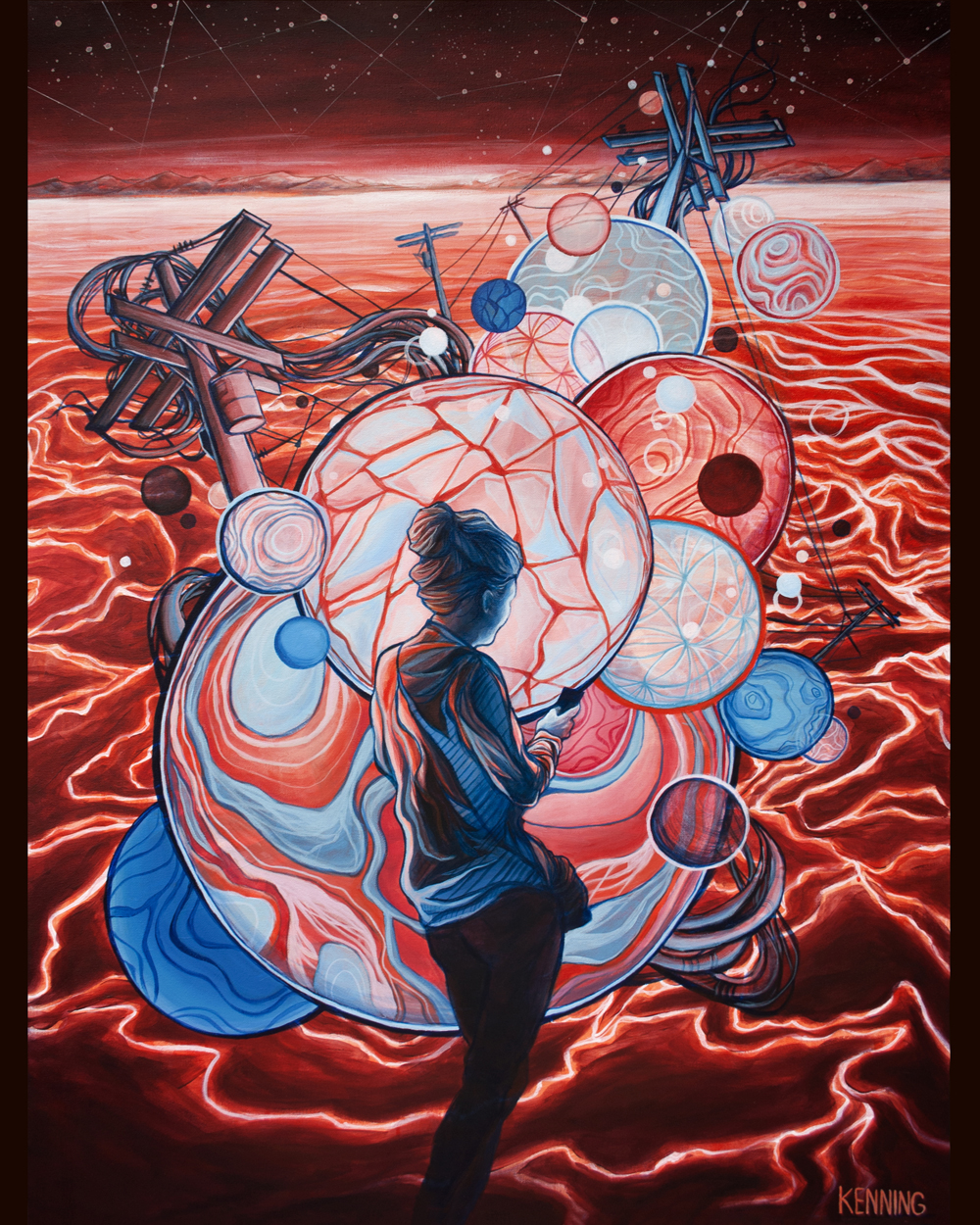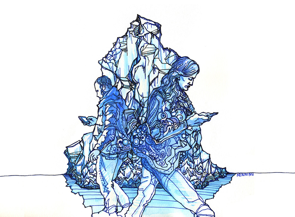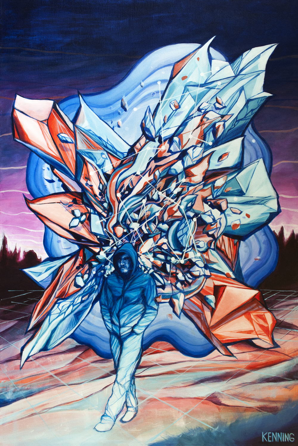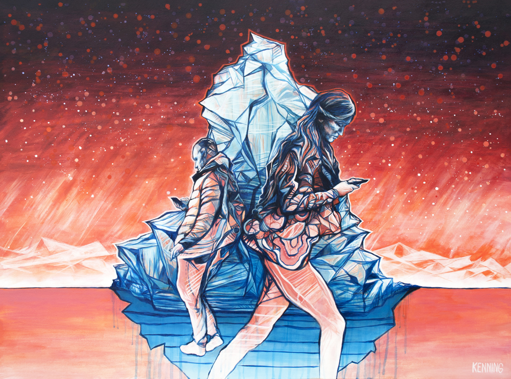 I use several repeating symbols and images in this series: barren worlds, alienated figures, cellphones, glaciers, and wires. Over the subjects hangs an ethereal cloud of consciousness and past memories. Jagged lines and networking planes add to a feeling of distressed communication between the characters and their environments. Power lines may connect them to earth, but smartphones imply their bodies are no longer tethered.