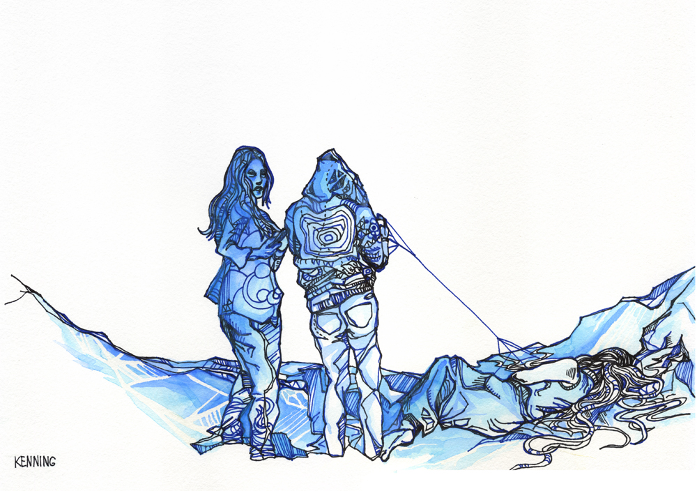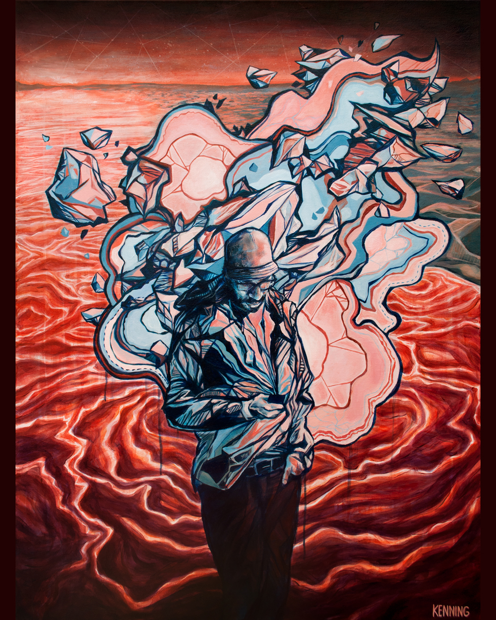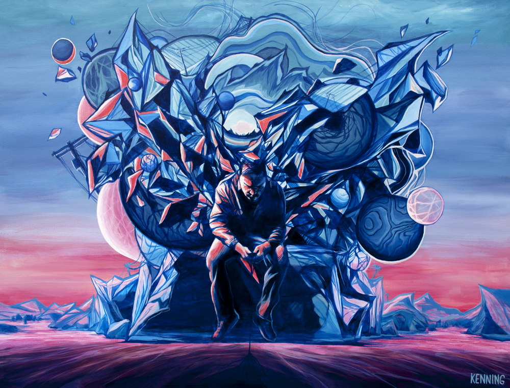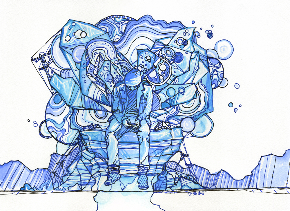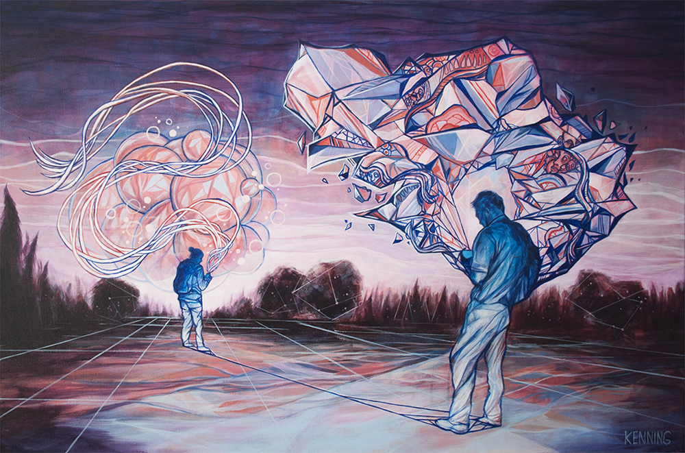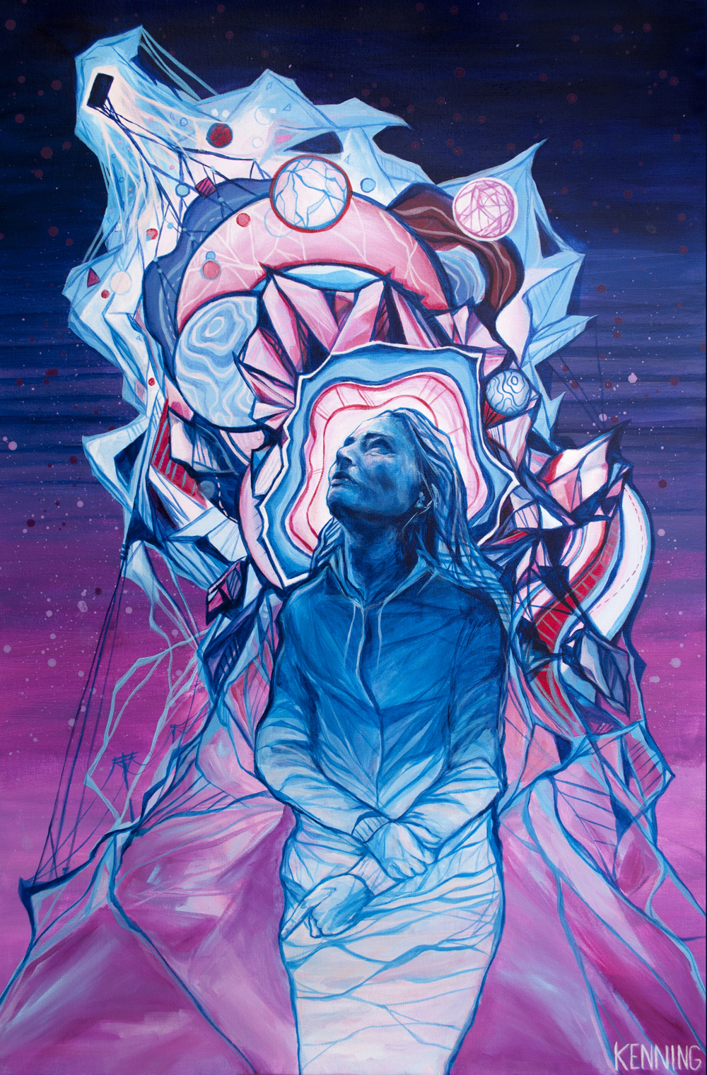 I use several repeating symbols and images in this series: barren worlds, alienated figures, cellphones, glaciers, and wires. Over the subjects hangs an ethereal cloud of consciousness and past memories. Jagged lines and networking planes add to a feeling of distressed communication between the characters and their environments. Power lines may connect them to earth, but smartphones imply their bodies are no longer tethered.