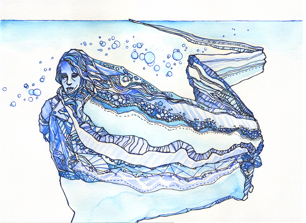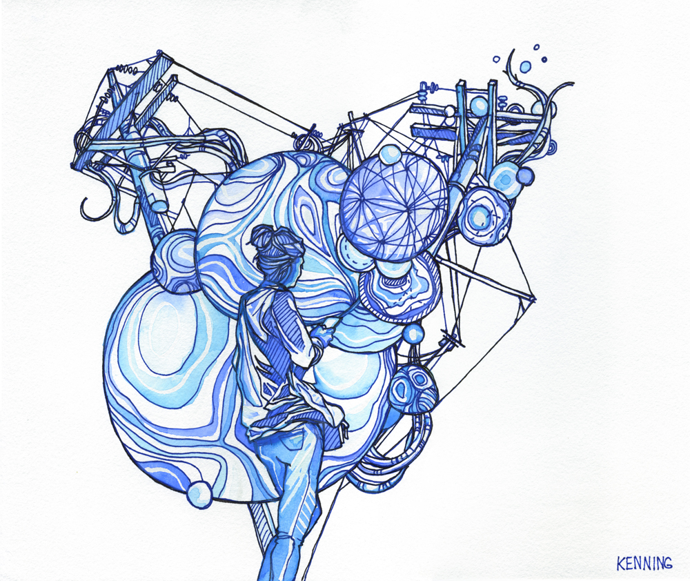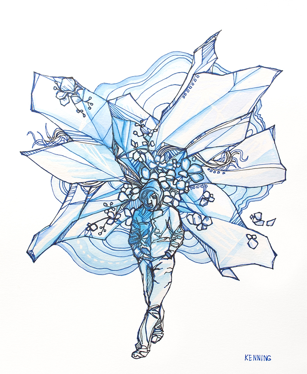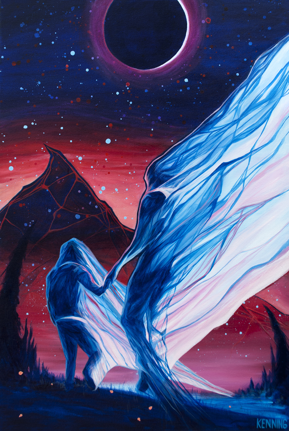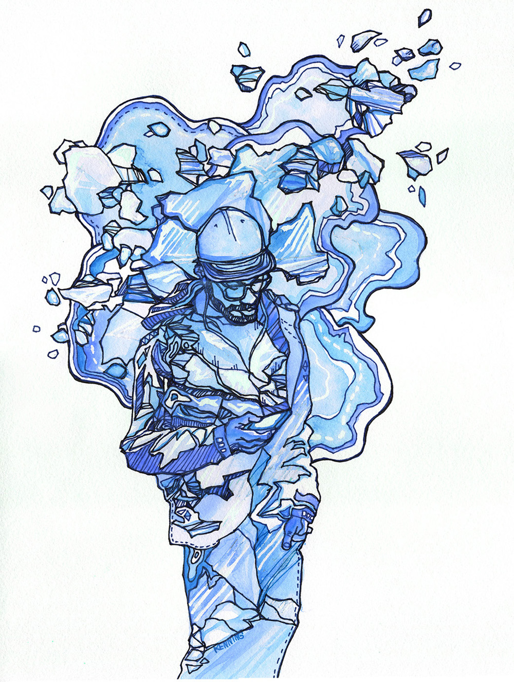 I use several repeating symbols and images in this series: barren worlds, alienated figures, cellphones, glaciers, and wires. Over the subjects hangs an ethereal cloud of consciousness and past memories. Jagged lines and networking planes add to a feeling of distressed communication between the characters and their environments. Power lines may connect them to earth, but smartphones imply their bodies are no longer tethered.