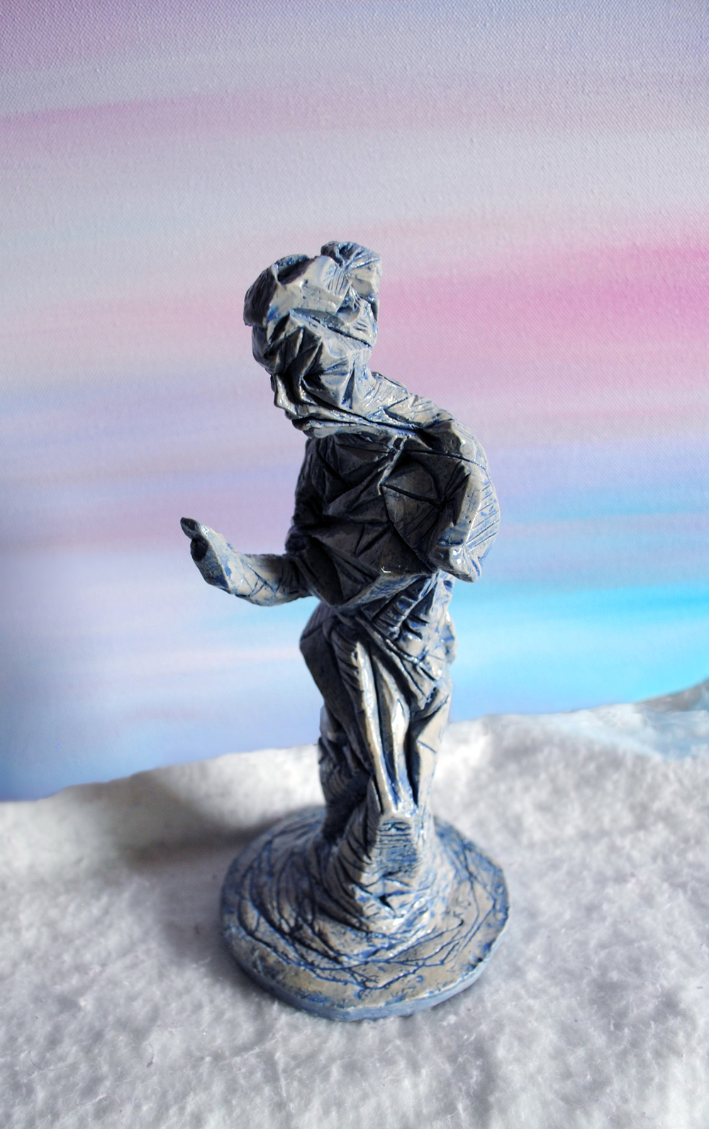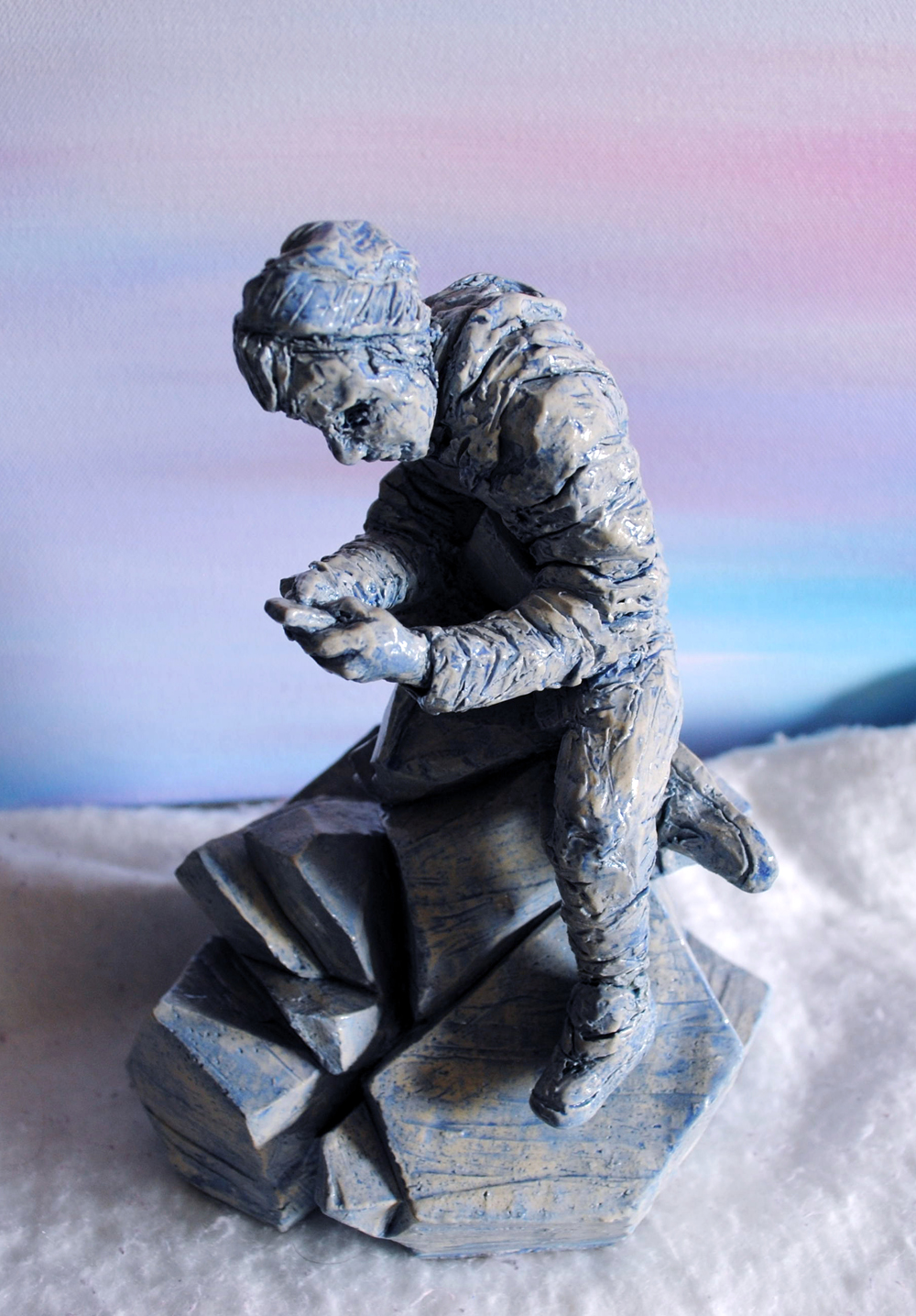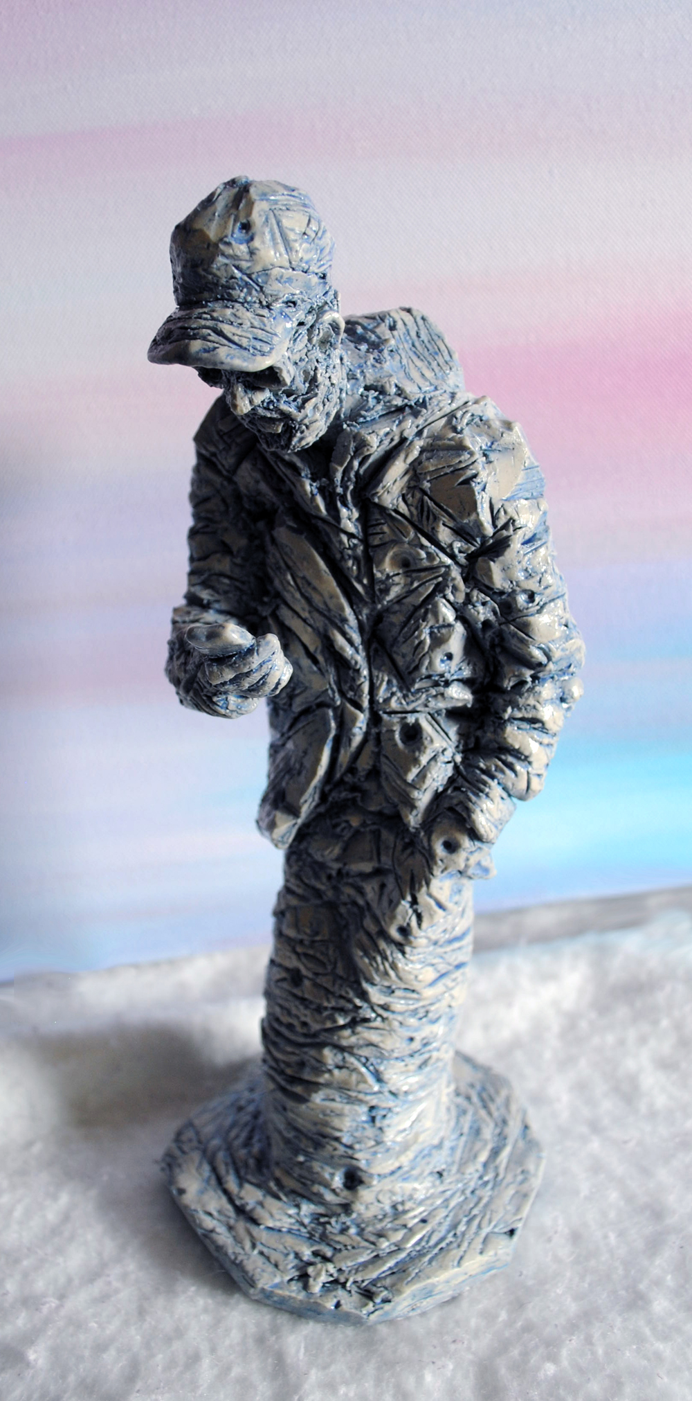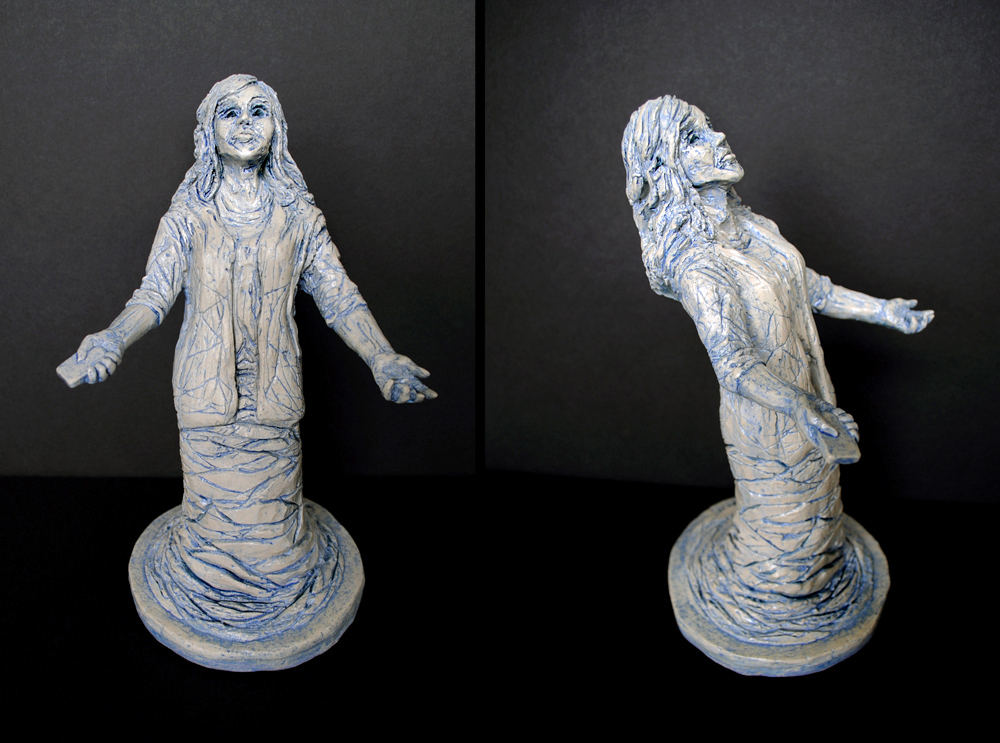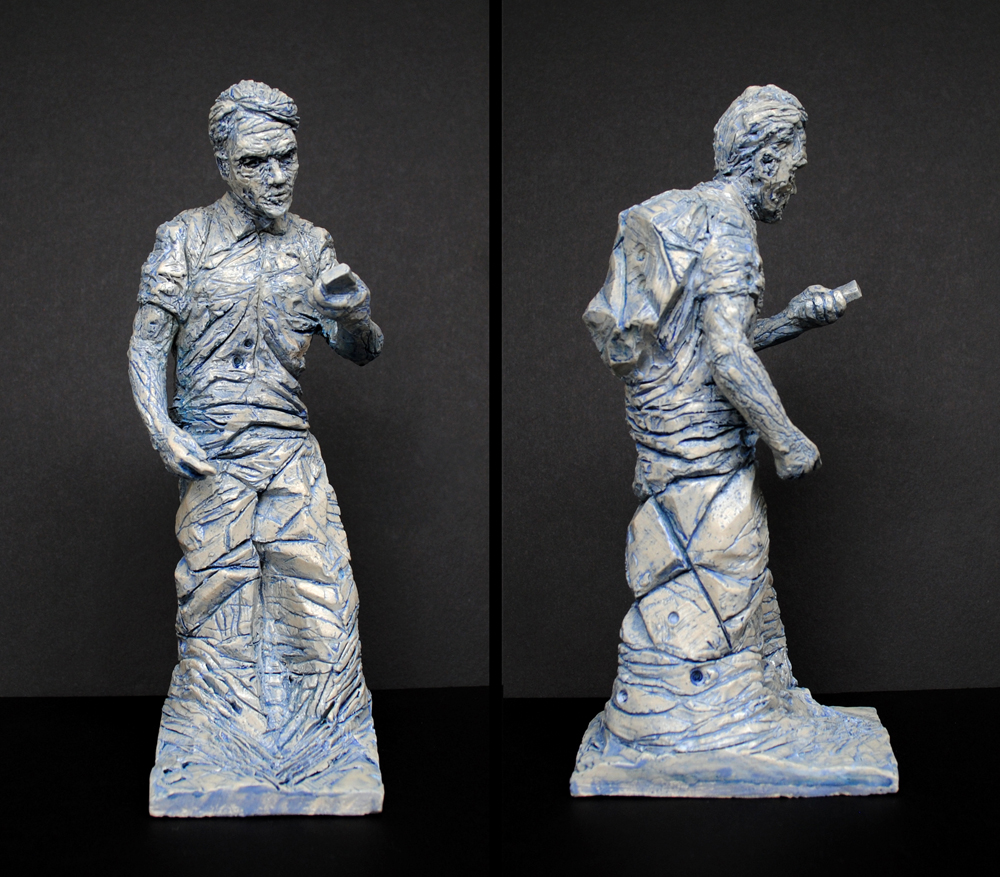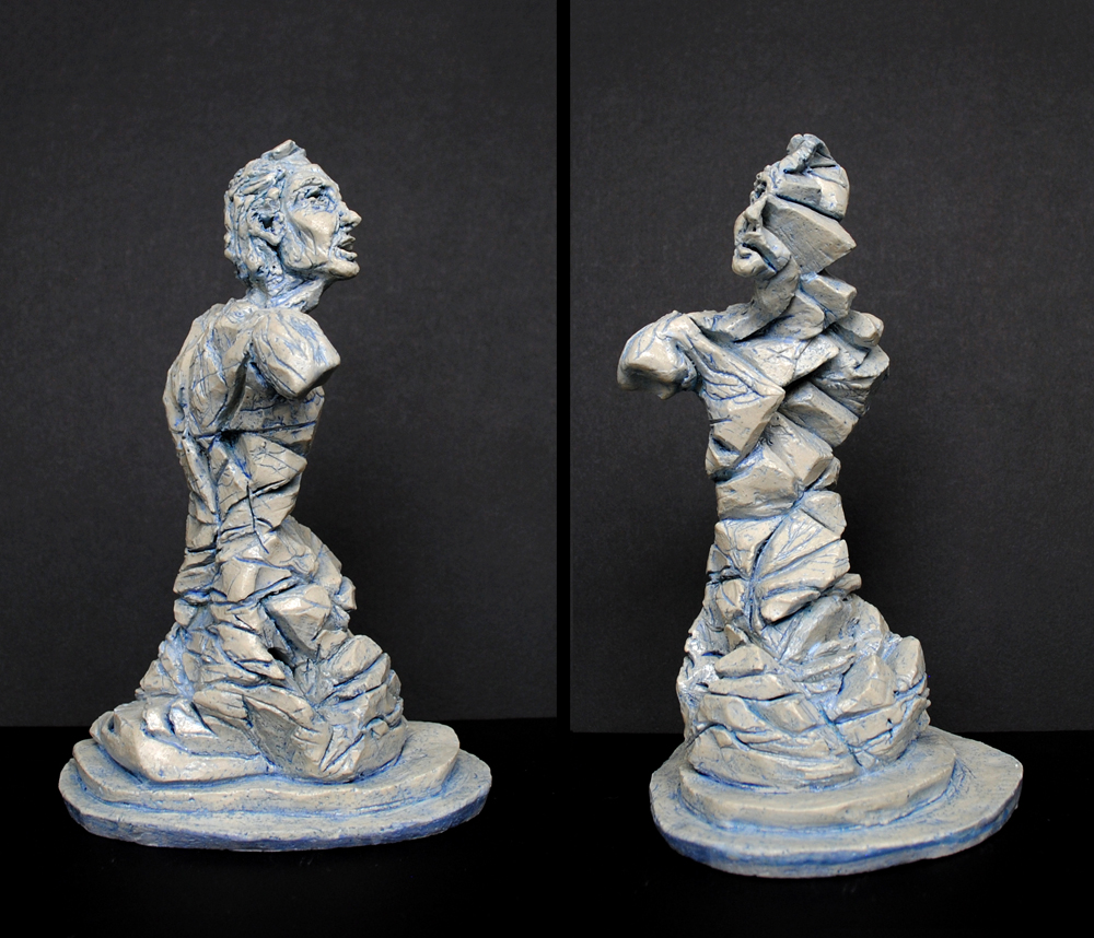 This series is divided into three sections. The blue and white watercolors act as a prologue and establish the characters. The painted canvases flesh out the disorder and the emotions surrounding these figures. Larger composition and a disconcerting red color scheme help draw the viewer into a foreign landscape. The final section is sculptural. Each ceramic work functions as a physical epilogue for our subjects. They appear trapped forever in icy stone.