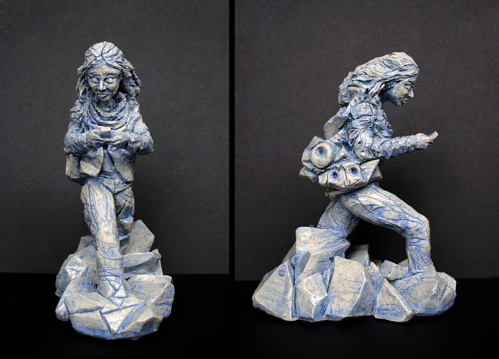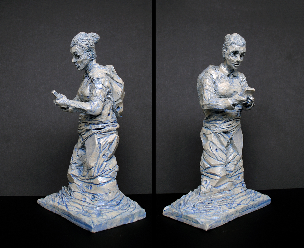 They are lone figures breaking connections to the land, their past, and others. Most of the characters stare blankly into their phones, forgetting the world around them. Others break the gaze and force a confrontation with the future. In this exhibit the personal optimism or pessimism of the viewer will ultimately decide how that confrontation ends.
